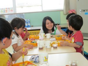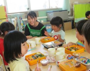 お弁当を開ける時の園児の目はキラキラとし、チキンライスのにこにこ笑顔で園児たちもにこにこと楽しそうにお弁当を食べていました。デザートのココアプリンは「甘くておいしい!」と今年も大好評でした。