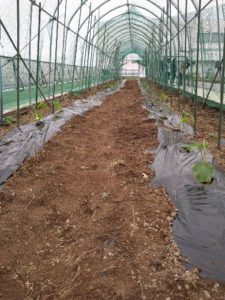 JA福島さくらのみなさんのご協力とご指導を仰ぎながら、圃場の整地から始まり、施肥した土壌に支柱を立てたり、畦を立てたところにマルチを張ったり。準備が整ったら定植開始です!