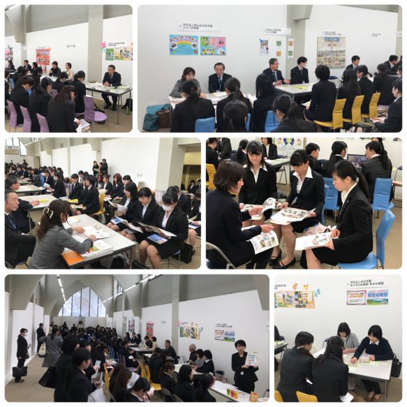 就職部主催の学内企業説明会が、県内外の企業44社に参加していただき本学建学記念講堂で6日に開催されました。説明会では、市内の11の幼稚園から幼児教育学科の1年生が各幼稚園の教育方針などについて説明をうけました。参加していただいた市内の幼稚園は次のとおりです。あけぼの・柴宮幼稚園、安積幼稚園、安積町つつみ幼稚園、エムポリアム幼稚園、大槻中央幼稚園、尚志・尚志緑ヶ丘幼稚園、田村町つつみ幼稚園、富田幼稚園、双葉・双葉第二幼稚園、みどり幼稚園、みらい幼稚園、以上11幼稚園。ご協力いただいた幼稚園・企業関係者の皆様に心より感謝申し上げます。