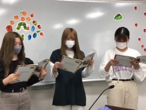 総合英語コミュニケーション♬幼児教育学科 R3年度 No. 14♬ 2021.09.15学内ブログ幼児教育学科幼児教育コースチャイルド・ミュージックコース 幼児教育学科です。 今回は「総合英語コミュニケーション」の授業についてご紹介します。 この授業はネイティブの先生が授業をされていますよ♪ 「はらぺこあおむし」の物語を英語で発表します。 グループごとに手袋シアターや飛び出す絵本など、いろいろな表現の工夫をしています。 みんな緊張しながらも楽しそうな表情が見えますね!