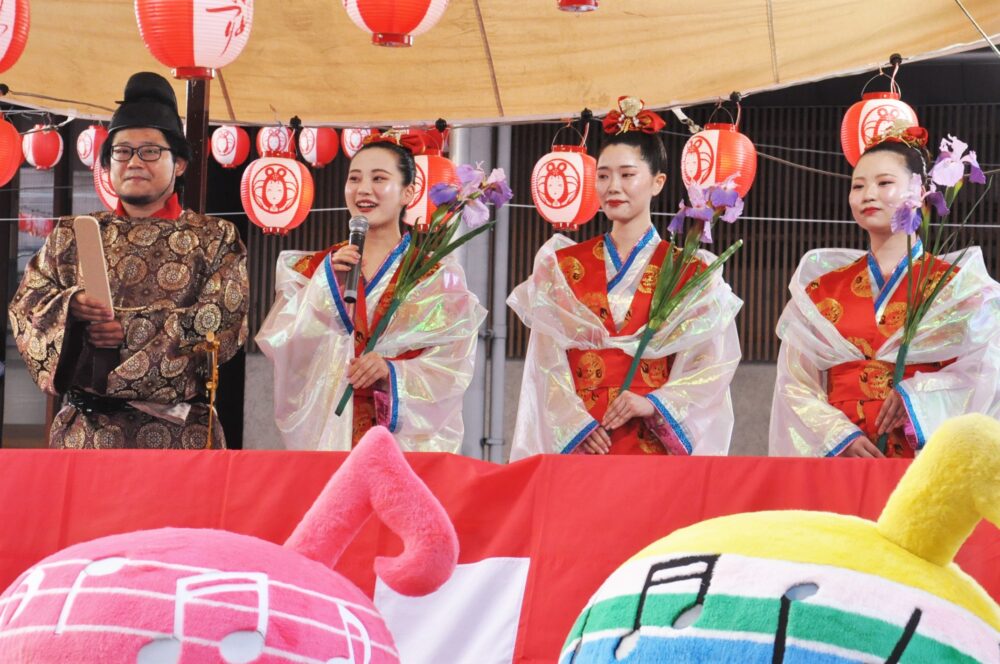 高田さんは一緒に選ばれた2名のミスうねめと共に時代衣装姿で登場。オープンカーに乗ってパレードした後、新旧うねめの交代式や郡山市の姉妹都市・奈良市の使節団の方々とのセレモニーに臨みました。