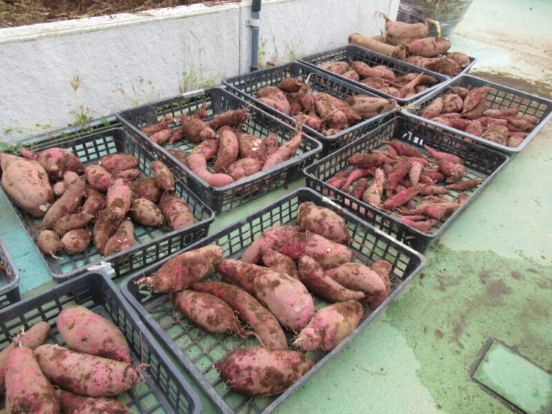 さつまいもは、5℃以下の環境になると低温障害を起こし黒く変色し甘さがなく苦味が強くなってしまいます。新聞紙で包み紙袋や段ボールにまとめ、日の当たらない涼しく風通しの良い場所でしばらく保存してから、実習の際に利用します。