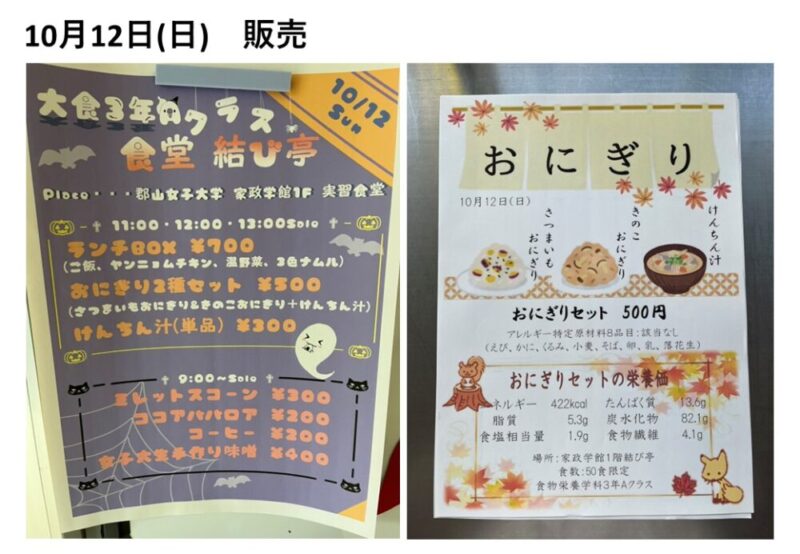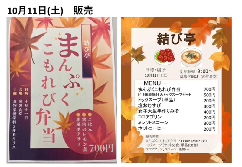 【食物栄養学科・もみじ会】結び亭 明日から開店!🍙 2025.10.10イベントニュースキャンパスライフもみじ会家政学部 食物栄養学科 今年度も、食物栄養学科3年生が「結び亭」を運営いたします! 給食管理実習の授業で提供し、好評だったメニューをお弁当用に再考案しました。 3年生の学生さんが頑張って調理しますので、是非お召し上がりいただければと思います♪ 販売メニューは下記の写真の通りになります。 食券と菓子類の販売は9時から、食券の引き換えは11時・12時・13時の3回を予定しております。 なお、11日(土)と12日(日)で販売メニューが変わりますので、ご注意ください。 昨年度は大盛況につき売り切れてしまうメニューもありましたので、ご希望の商品がございましたら、お早目に食券をお求めいただければと思います。