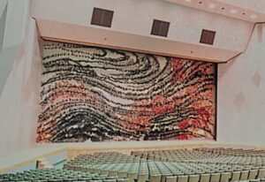 また、短期大学部の仲田佐和子准教授は「建学記念講堂緞帳制作の思い出」と題し講演。関口名誉学園長のデザインで当時の学生・生徒・教職員の共同作業によりアルミ製ピース約12万個を使用して編み上げた緞帳「年輪」について語ります。