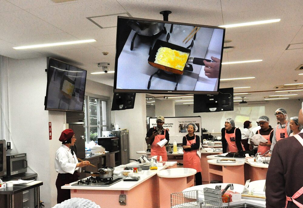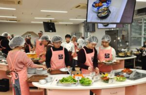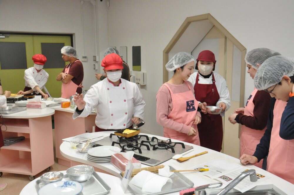 調理実習では、食物栄養学科の教員と学生の補助を得ながら、だし巻き卵作りなどに挑戦。様々な好みの具材を入れた「おにぎらず」や野菜たっぷりのスープを作り試食しました。
