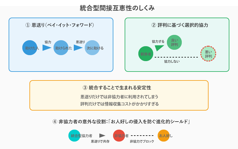 私たちの研究では、この二つの仕組み(恩送りと評判に基づく協力)を組み合わせた「統合型間接互恵性」という考え方を提案し、それが大人数のグループでどのように機能するかを数学的に分析しました。