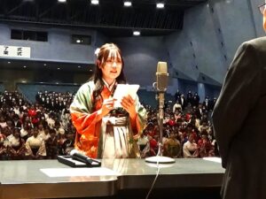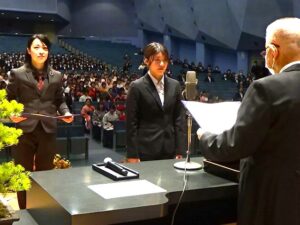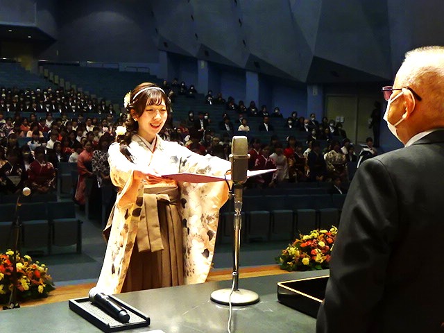卒業生を代表し、幼児教育学科の角田涼芭さんが答辞を述べ「仲間と励まし合い、先生方の温かいご指導を受けながら一歩ずつ成長できました。ここで培った学びと経験を胸に、それぞれの立場から人々や地域に貢献できるよう成長を重ねていきます」と誓いました。