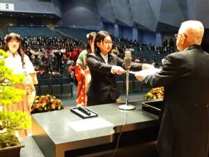 大学院2名、大学2学科101名、短大専攻科2専攻14名、短大3学科174名の計291名が呼名され、関口修学長から各総代らへ学位証や卒業・修了証書・学位記が授与されました。