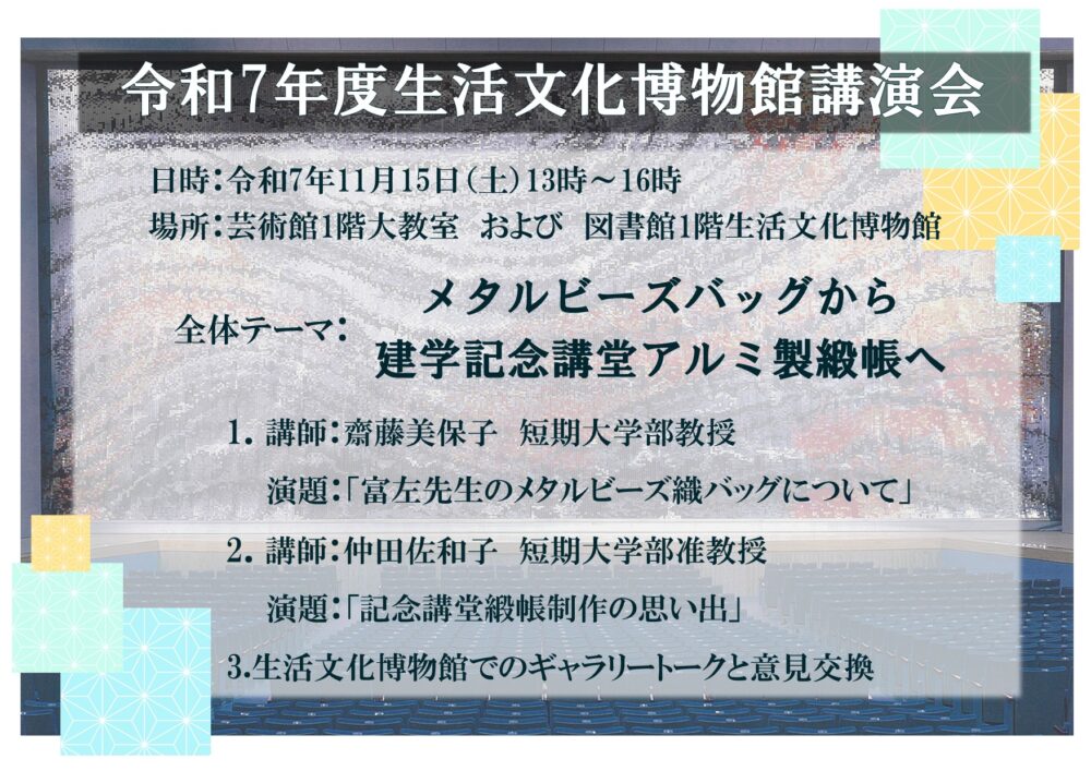 令和7年度 生活文化博物館講演会 全体テーマ「メタルビーズバッグから建学記念講堂アルミ製緞帳へ」